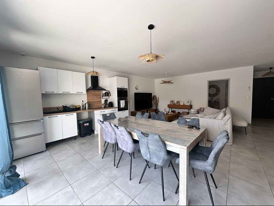 L'entrée s'ouvre sur une spacieuse pièce de vie de 46 m² climatisée, comprenant un séjour lumineux et une cuisine américaine entièrement ouverte, moderne et fonctionnelle, donnant accès à une terrasse carrelée idéale pour vos repas en extérieur.